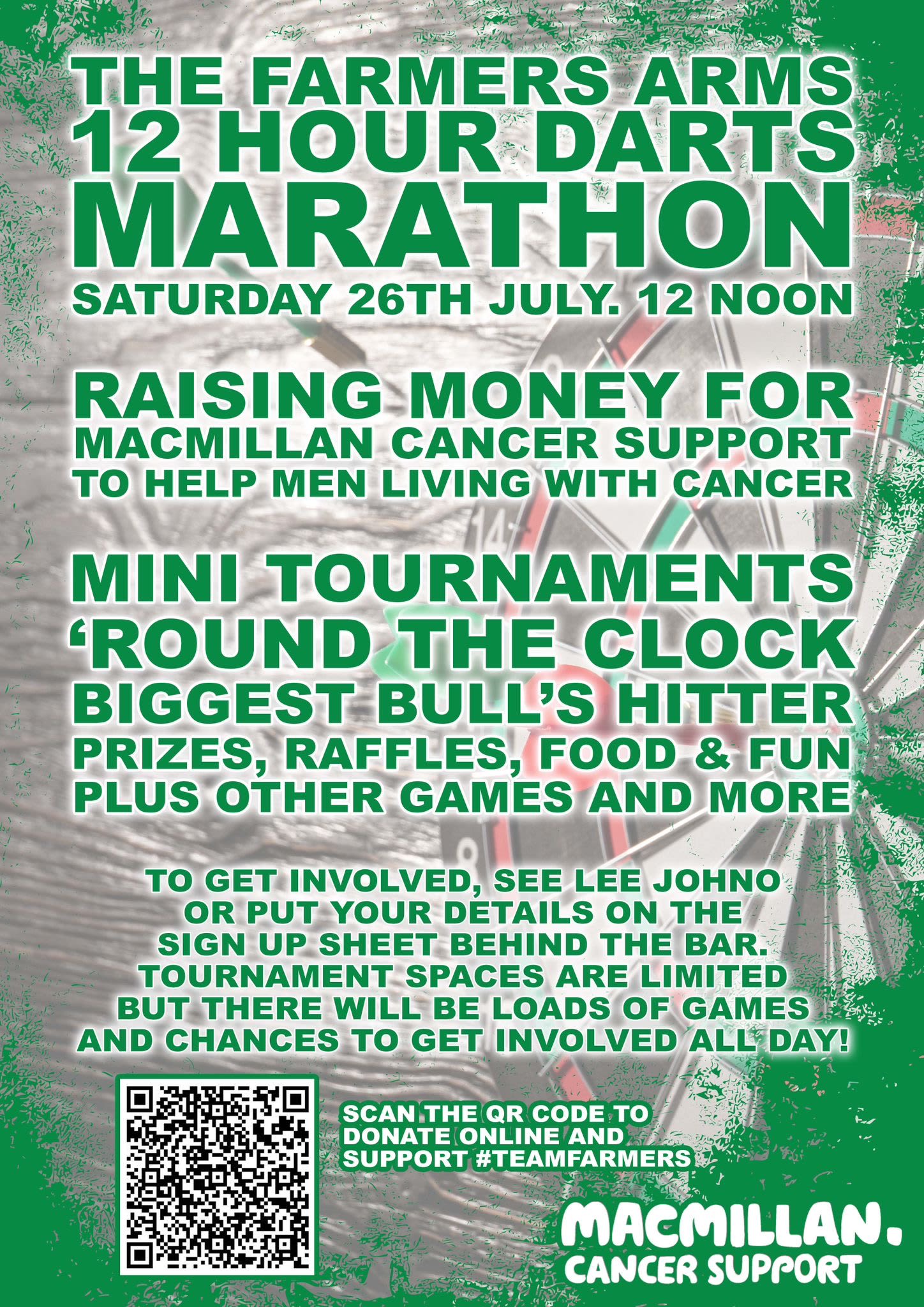 There’s a couple of mini tournaments, round the clock, the biggest bull’s hitter, other darts games, quiz, food, raffles and as usual lots more that will make it a great fun filled day for a great cause! If anybody wants to get involved in the tournaments, there’s going to be 2 knockouts. One around 12/1 and the other around 6/7. Either get in touch with me directly or there is a sign up sheet behind the bar. All the other mini games and comps you can simply get involved on the day. There’s also a sponsor form behind the bar or you can click this link ‘https://dartsmarathon.macmillan.org.uk/teams/the-farmers-arms-and-friends’ and donate directly on the macmillan website.